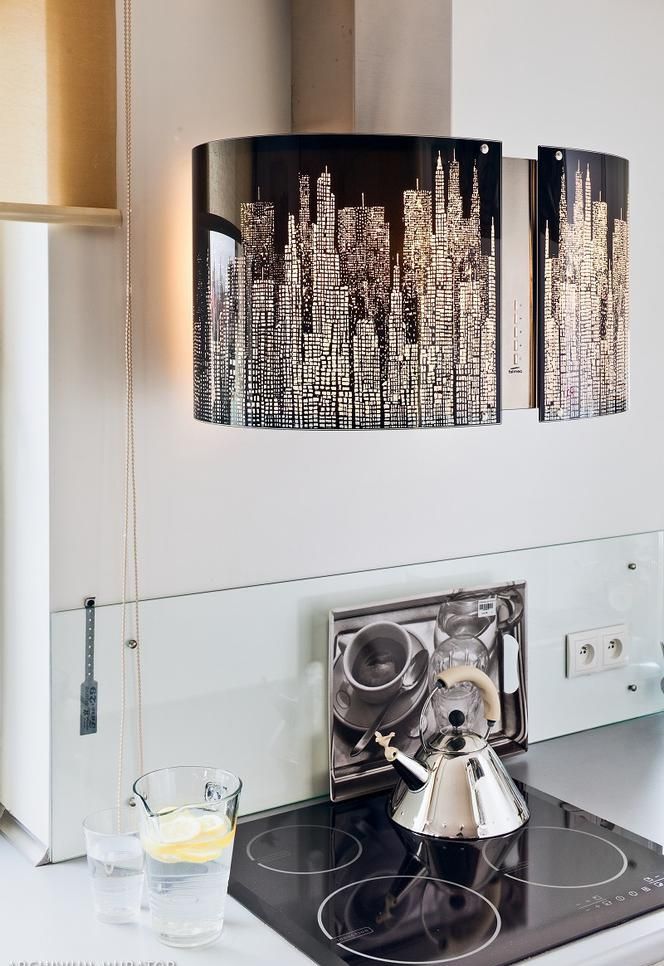 Basit bir yuvarlak davlumbaz, mutfak dolaplarının ve tezgahların geometrik şekillerine meydan okuyarak çizgilerini biraz daha yumuşak gösterir.